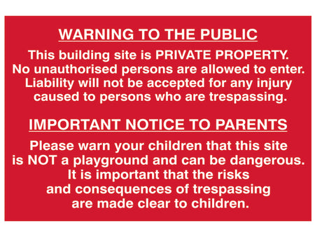 Building Site Warning to Public & Parents - PVC Sign 600 x 400mm