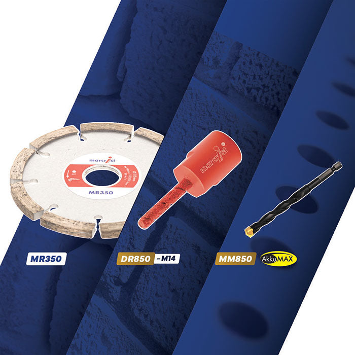 MR350 - Ø 115 x 22,2 mm universal raking blade for the renewal of old mortar joints. Precision engineered core. Vacuum brazed fusion technology. DR850 - Ø 8mm Precision removal of old mortar and cleans brick joints for repointing. MM850 - Ø 8mm Pilot drill bit for use with DR850-M14.