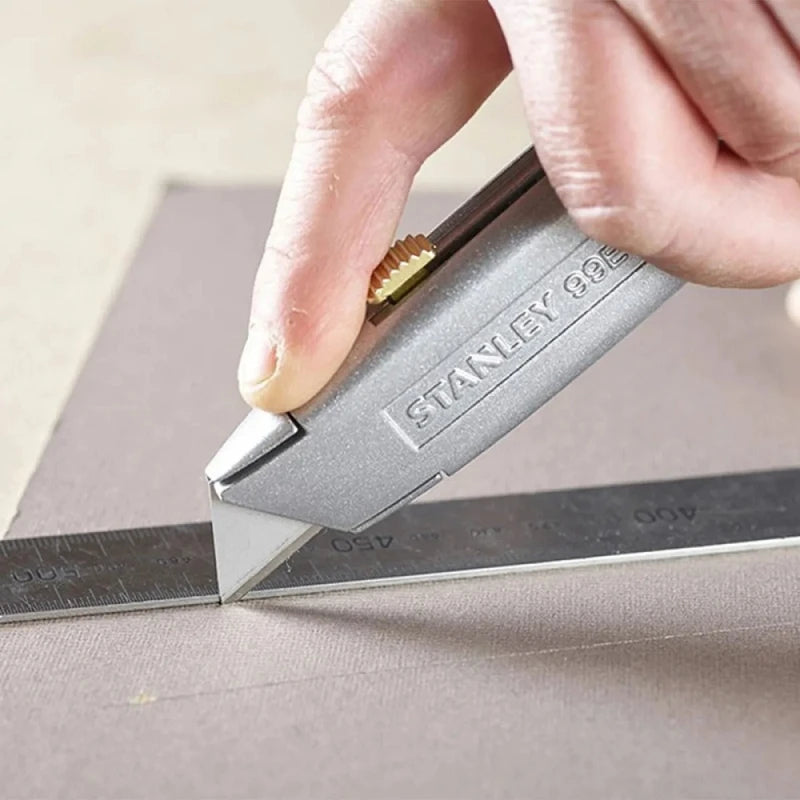 The STANLEY® 99E Trimming Knife Twin Pack. Made from grey painted die-cast metal body, which is ergonomically shaped for a good, comfortable grip. The blade extension can be controlled by the blade shifter, and 5 blade position allows a wider usage for a variety of cutting applications. The interlock nose firmly secures the blade into the knife. For safety, the blade can be fully retracted into the body.